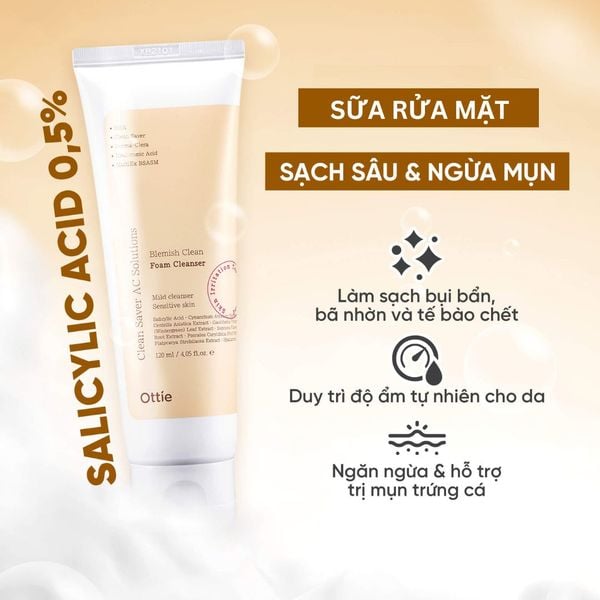 Ανακαλύψτε το μυστικό για αψεγάδιαστη επιδερμίδα με το OTTIE BLEMISH CLEAN FOAM CLEANSER! Αυτός ο καινοτόμος αφρός προσώπου, εμπλουτισμένος με σαλικυλικό οξύ, προσφέρει βαθύ καθαρισμό και εξαιρετική φροντίδα του δέρματος, απομακρύνοντας αποτελεσματικά τις ακαθαρσίες και το υπερβολικό σμήγμα. Με προσεκτικά επιλεγμένα συστατικά όπως σαλικυλικό οξύ, εκχύλισμα Centella Asiatica και εκχύλισμα ρίζας γλυκόριζας, αυτός ο αφρός όχι μόνο καθαρίζει αλλά και καταπραΰνει τους ερεθισμούς και προλαμβάνει νέα σπυράκια. Το σαλικυλικό οξύ δρα βαθιά στους πόρους, απομακρύνοντας τους ρύπους και μειώνοντας τα μαύρα στίγματα. Η γλυκερίνη και το υαλουρονικό οξύ ενυδατώνουν το δέρμα, αφήνοντάς το απαλό και ελαστικό. Το OTTIE BLEMISH CLEAN FOAM CLEANSER είναι τέλειο για την καθημερινή περιποίηση του δέρματος, ειδικά για όσους έχουν δέρμα με ακμή και ατέλειες. Η τακτική χρήση αυτού του αφρού καθαρισμού θα σας δώσει φρέσκο, καθαρό και υγιές δέρμα που πάντα επιθυμούσατε.